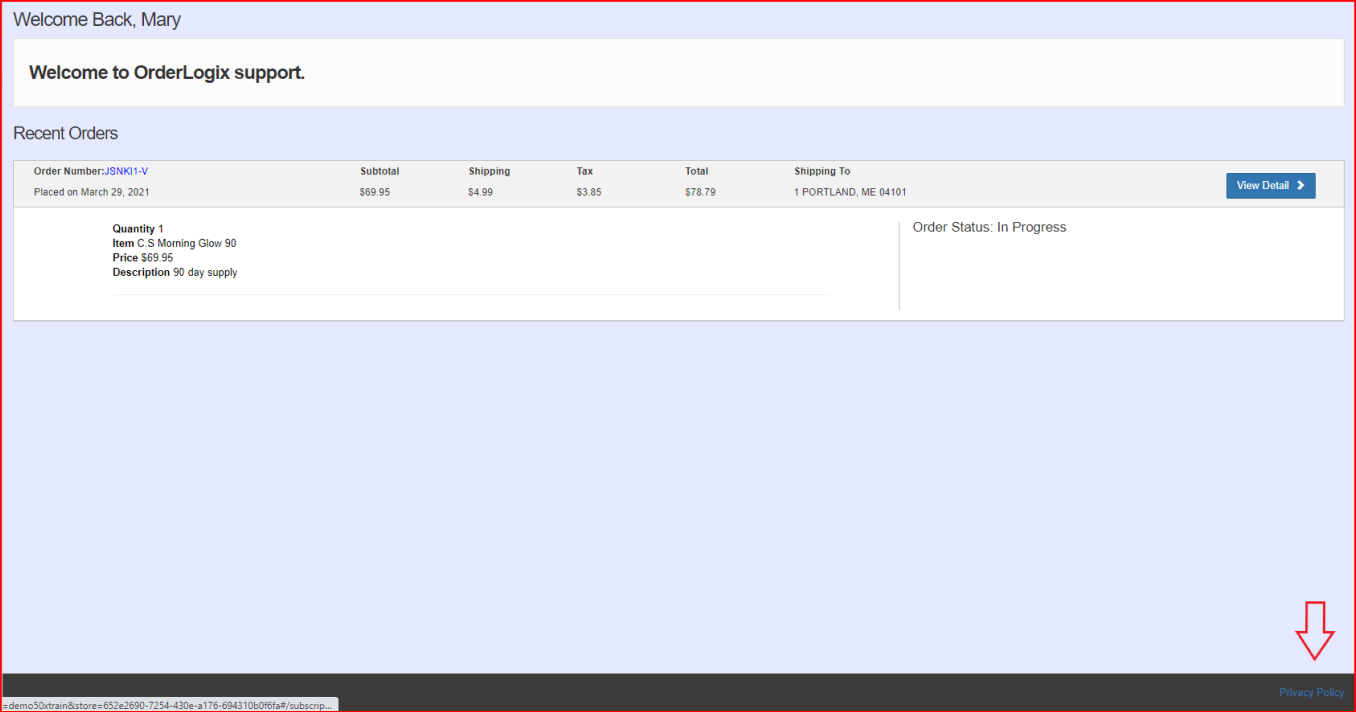 The Privacy Policy Text can be viewed via a link found on the right side of the footer within the customer portal.