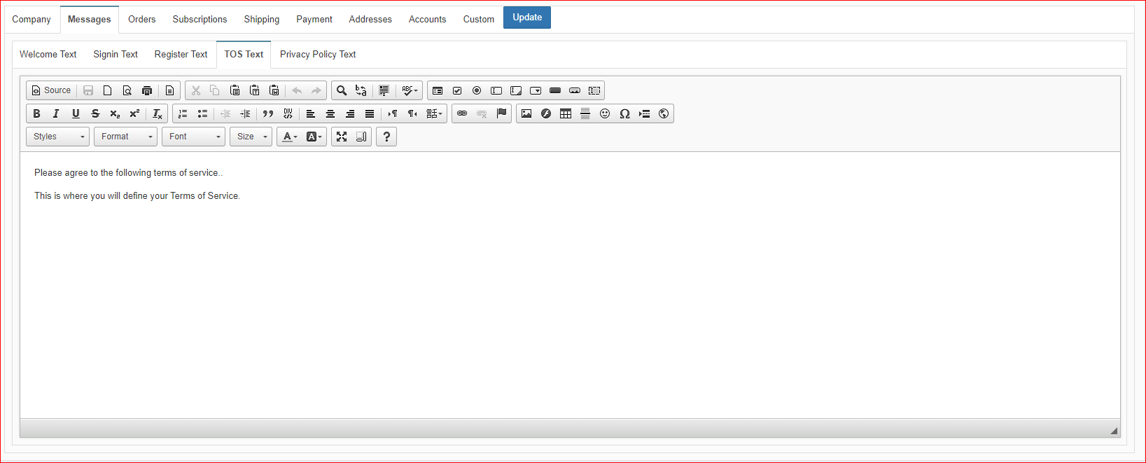 The TOS Text is the Terms of Service (Terms & Conditions) your customers agree with to utilize your customer portal.
