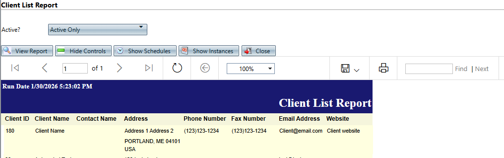 - Client List - Displays a list of your company's clients. Add, edit and de-activate clients.