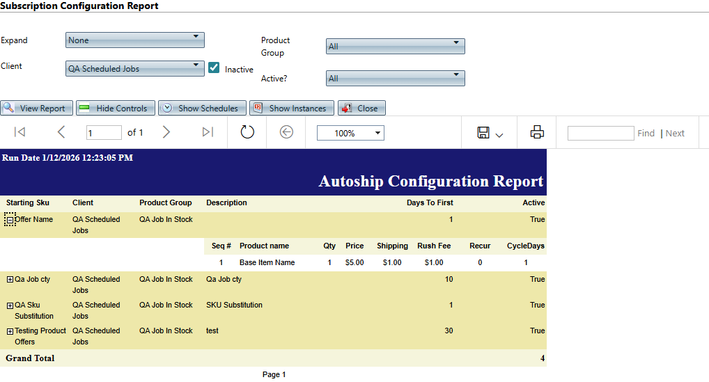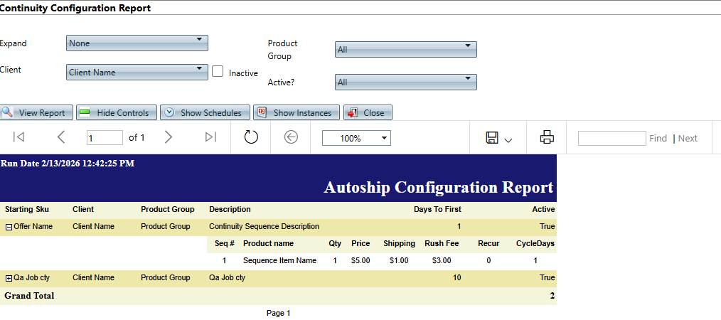 Path: Reports > Continuity/Installment Reports > Continuity Configuration Report