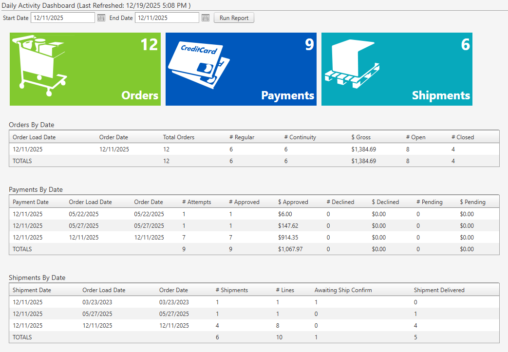 The Daily Activity Dashboard displays Orders, Payments, and Shipments by date.