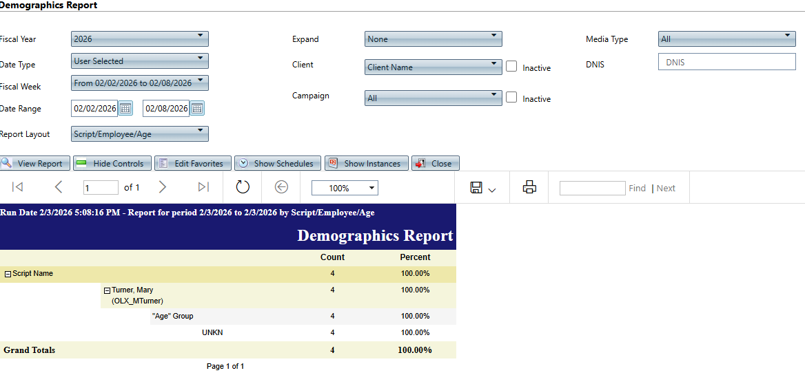 This report displays custom and demographic information for calls. Each custom or demographic value will be preceded with the group name i.e. "Custom1" Group or "Age" group