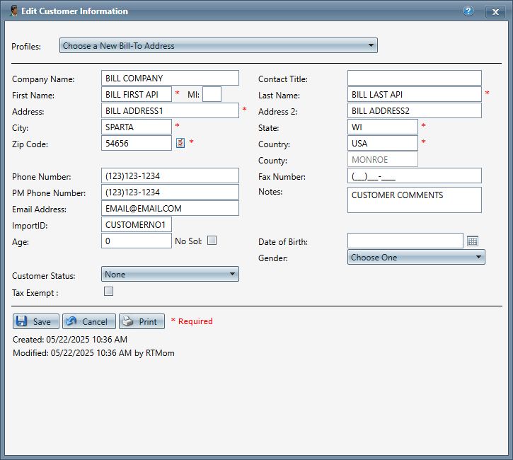- In the Edit Customer Information window, you can either load an existing Bill-To Address to set as the new Master Customer Address, or you can enter information directly into the text boxes.