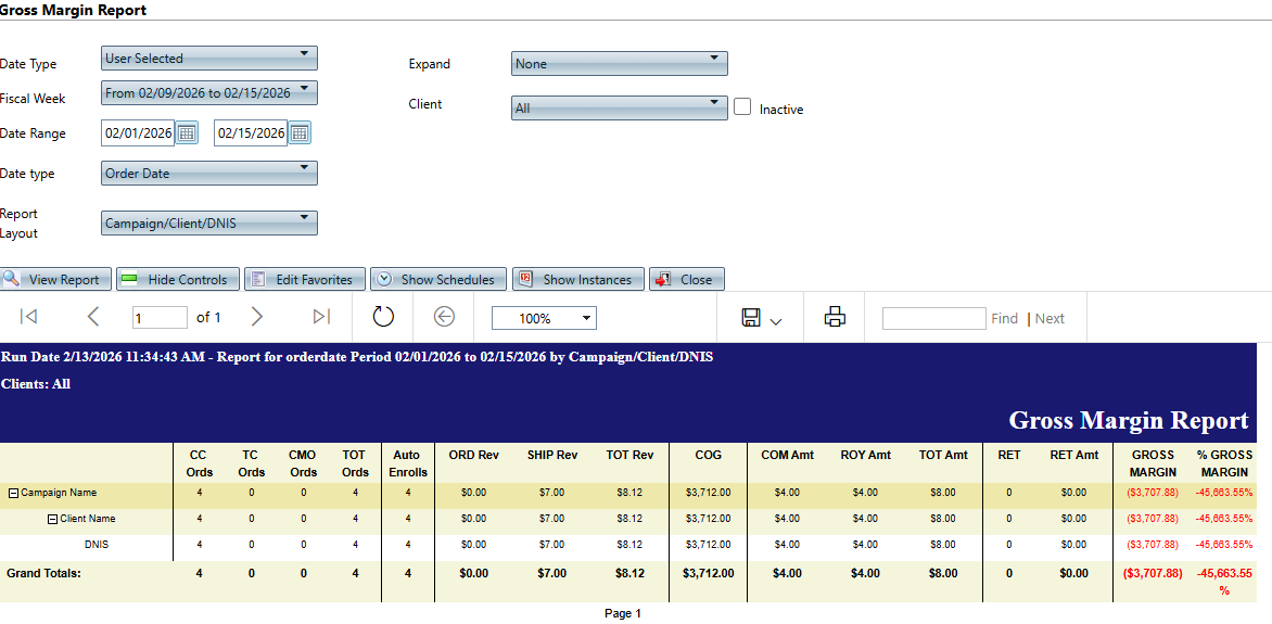 This report is for successfully processed debit and credit items in the specific date range (order date, payment date or shipment date). It includes product cost, commission and royalty amounts and shows returned revenue information to determine the gross margin dollar amount and percentage