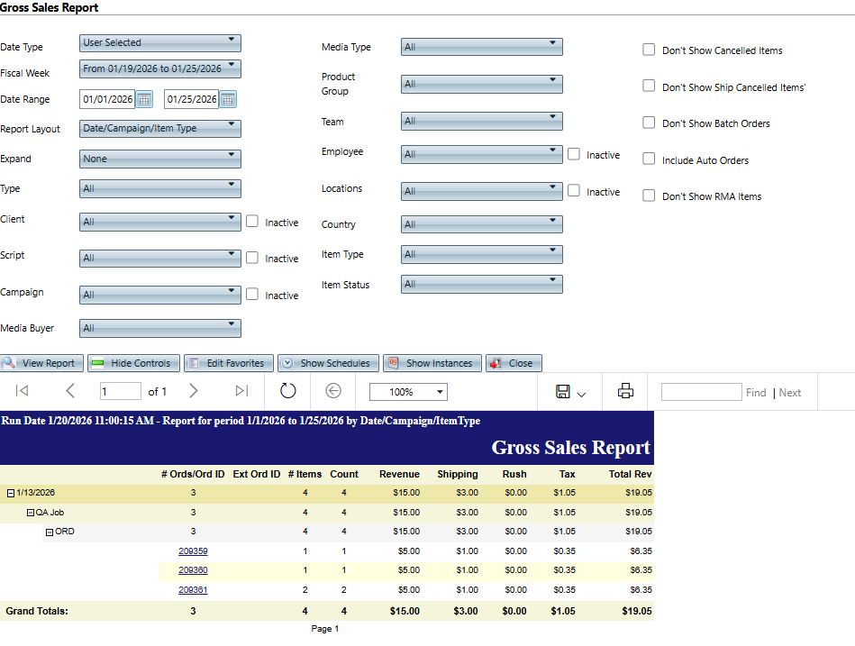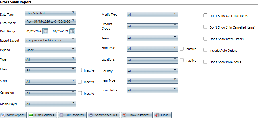 Don't Show RMA Items | - Checked - do not include debit items that have an RMA item attached to them (open or closed).