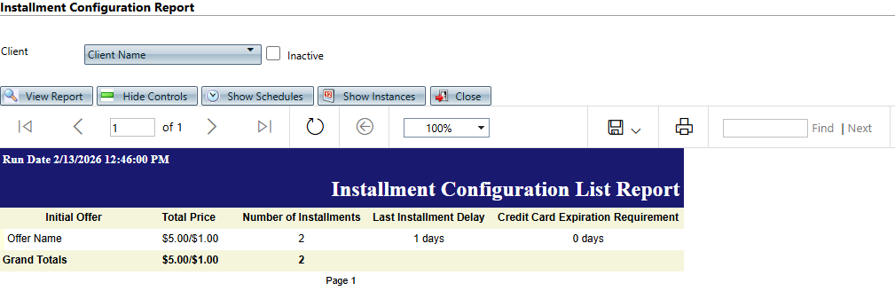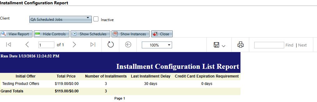 Path: Reports > Continuity/Installment Reports > Installment Configuration Report