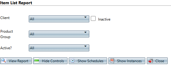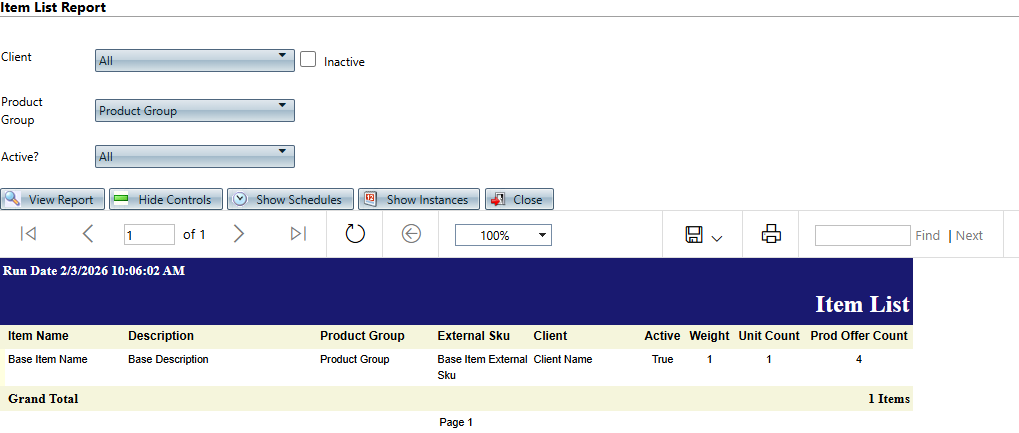 You can use the (product) Item list report to view product items by Client, Product Group, or Active status. The report shows the (product) Item Name, Description, Product Group, External SKU, Client, Active Status, and number of product offers for the (product) item. Select "Show Inactive" boxes to view inactive information in filters.