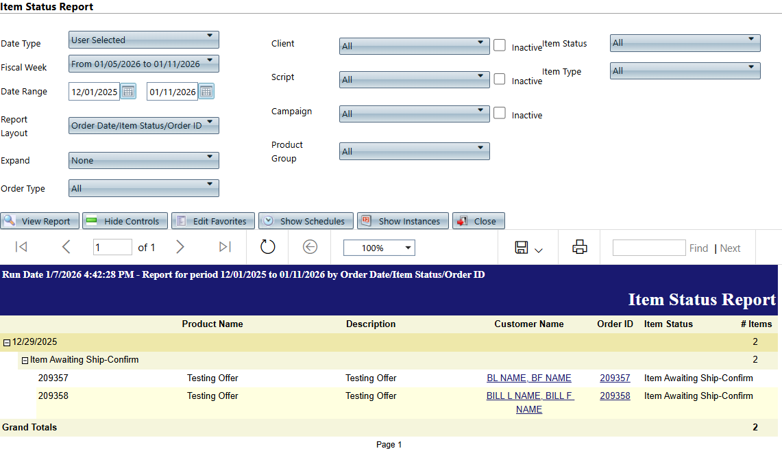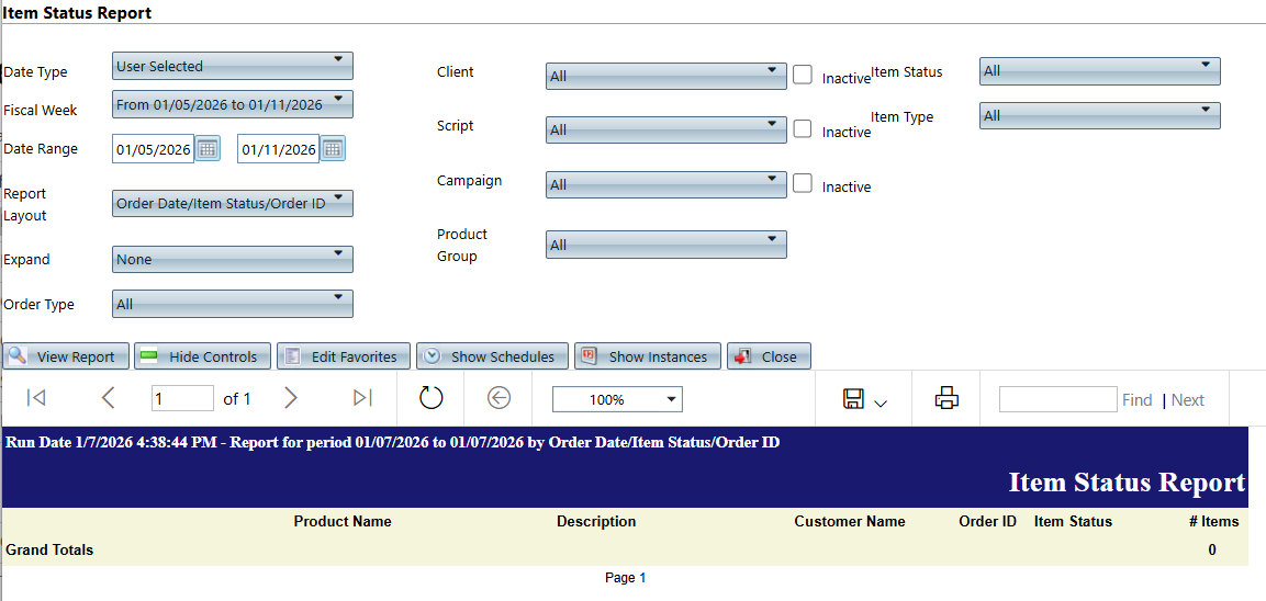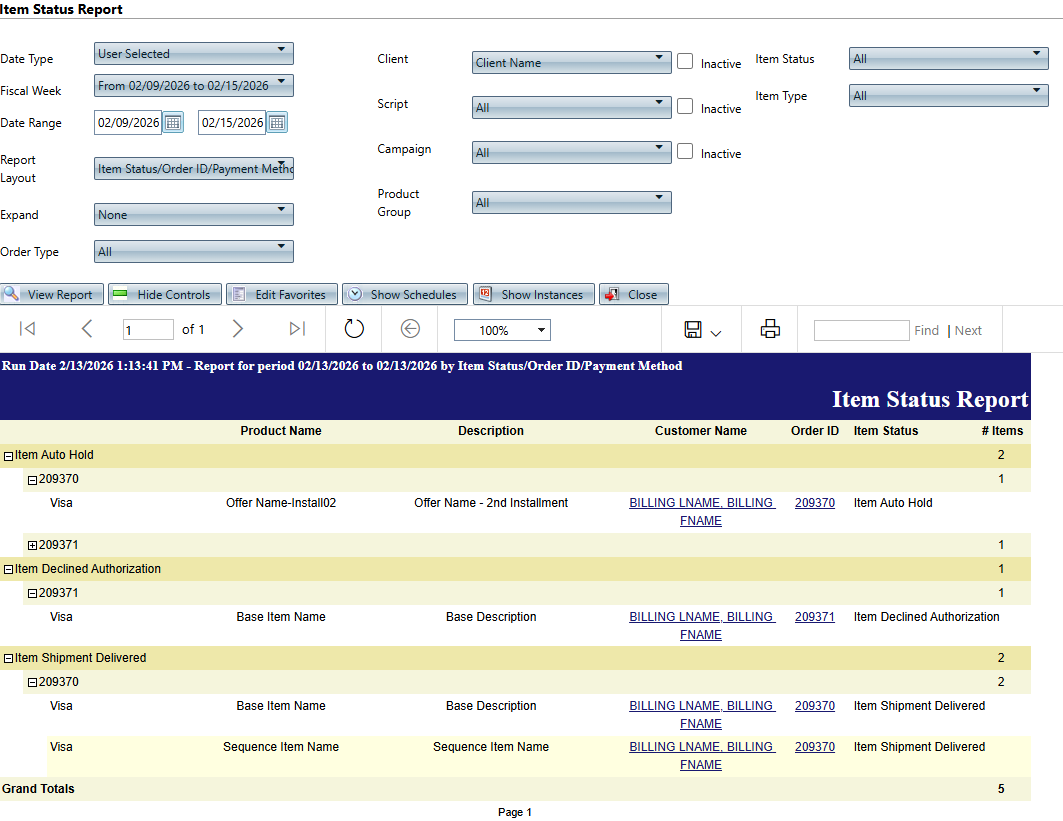 Report Layout | 3-layer filter to display report data (see Grouping below) example if set to Order Date/Item Status/Order ID: |