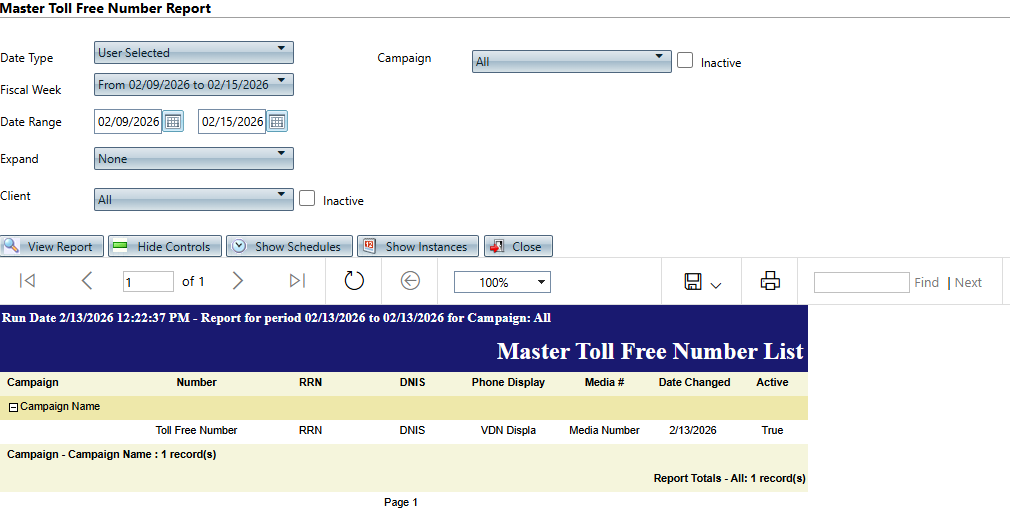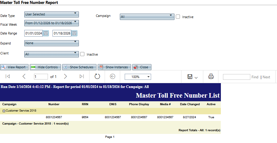 Path: Reports > Call Reports > Master Toll Free Number List Report
