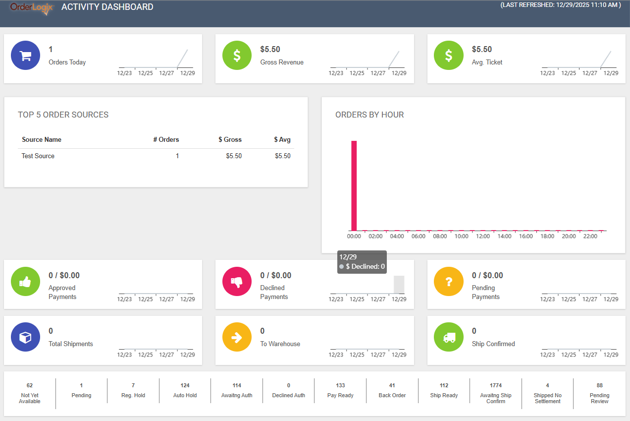 Module: Reports Path: Reports > Processing Reports > Daily Activity Dashboard Topic: Daily Activity Dashboard Version(s): 5.1 and up Editions: All What Is Daily Activity Dashboard The Daily Activity Dashboard displays Orders, Payments, and Shipments ...