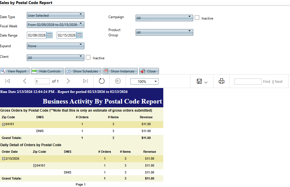 This report is for an order date range and displays information grouped two different ways: by zip code and DNIS and also another section grouped by order date, zip code and DNIS. This report includes all items including credit items.