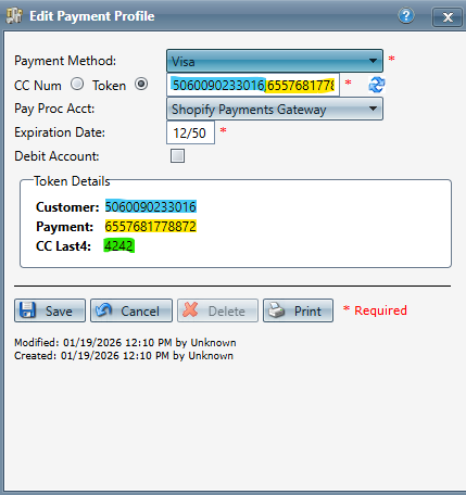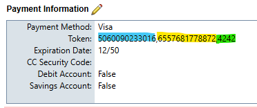 Customers that have tokens applied to orders will have this information securely stored on their detail center in the payment profile section, for use if a refund is needed on the order. Once viewing the payment profile tab, you will see all profiles stored for a given customer and a "dummy" credit card number will be applied to the "credit card number" field in the profile based on the details stored in the system preferences section. This is necessary due to the credit card details being required on order, however if a token is present that will trump the card number. The token will be visible to the right-hand side of the payment profile details: