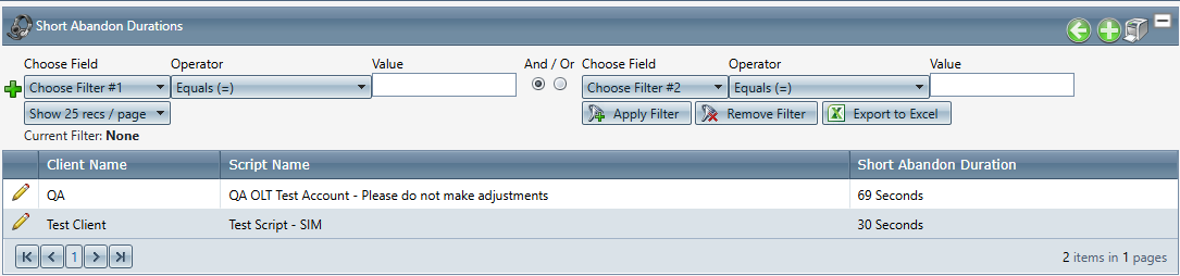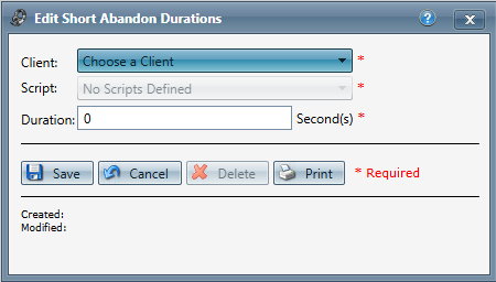 Short abandon is an unanswered call that rings less than (default) 15 seconds before dropped (never answered). The Short Abandon Durations menu allows you to create time durations for short Abandoned calls based on client and script and set the duration to a time other than 15 seconds.