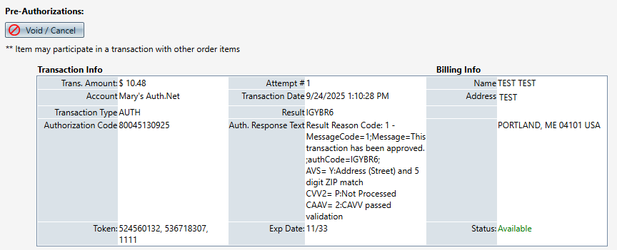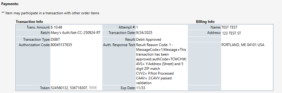 The middle section of the Transaction Details window will provide details about the item’s Payment Transactions.