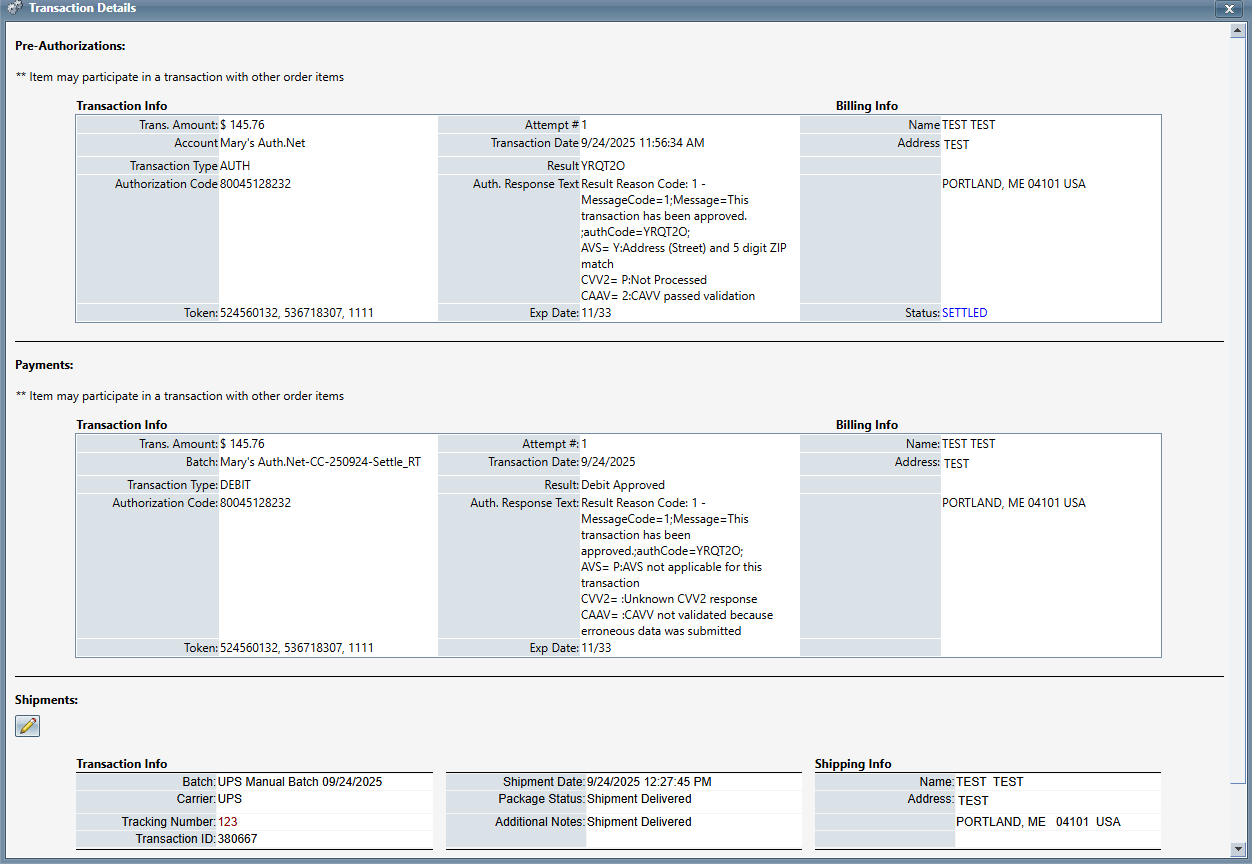 The Transaction Details window provides a user with information about payment and shipment transactions for an item. This window is access by clicking on the item status on the Order Detail Page or in the Customer Detail Center.